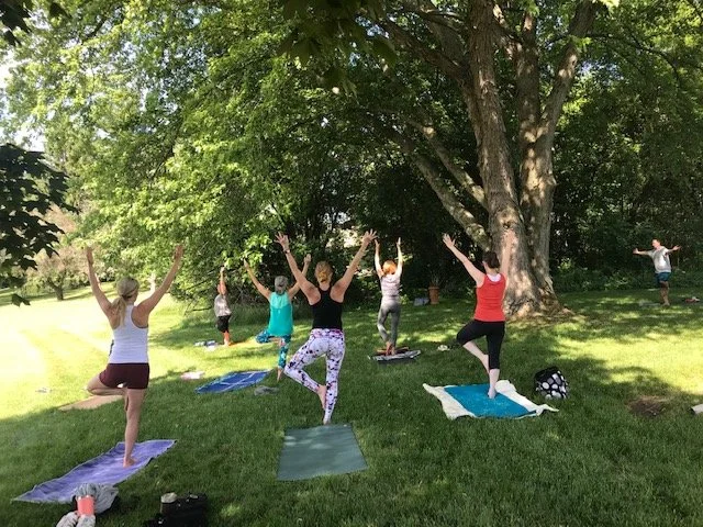A group of people participating in yoga outside, at a private event hosted by Yoga 4 All yoga studio in Wisconsin